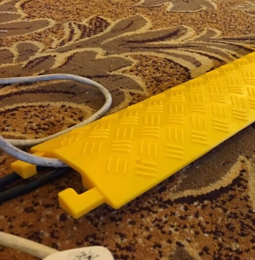 線槽板的頭部凸出部分卡著另一塊線槽板的尾部凹槽部分,相互卡住可以防止線槽板跟隨車輛前行或后退,更好的保護電纜。另外線槽板雖為橡膠制品,有一定的柔韌性,但為了延長使用壽命,好不要高距離拋扔。使用完畢后如需清洗,可用濕布擦拭完畢后,全部統(tǒng)一放在平整地面并正面疊放,防止底部變形,影響與蓋板的貼合度。